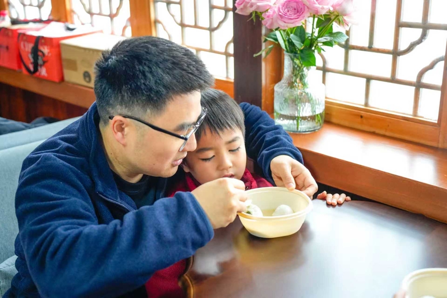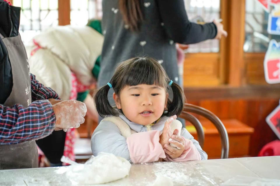 活动以水果汤圆为核心亮点,现场提供芝麻、草莓、荠菜肉三种特色馅料,市民游客在专业老师指导下,免费体验揉面、包馅、塑形等环节。不少家长带着孩子一同参与,在动手过程中感受民俗文化。“带着孩子一起来包汤圆,既能体验传统习俗,又能尝到新鲜的水果口味,比在家里过节有意思多了。”一位参与活动的市民笑着说。